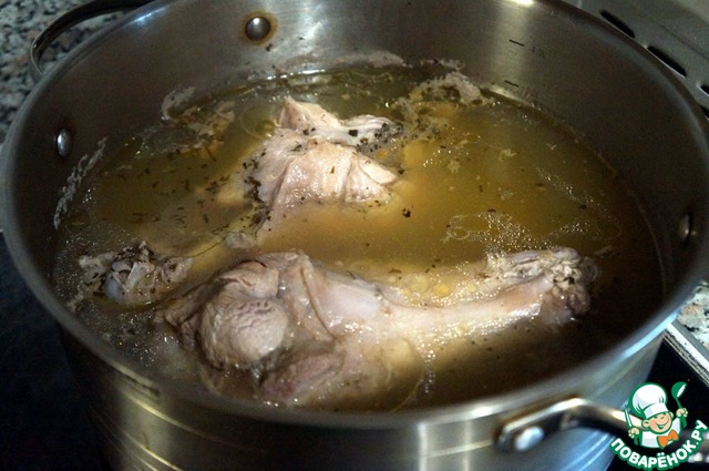 Из готового бульона вынуть голени, снять мясо с костей, порезать.