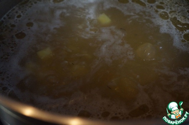 Бульон процедить или просто шумовкой вынуть перец и пастернак, довести бульон до кипения, отправить картошку. Варить 10 минут на среднем огне.