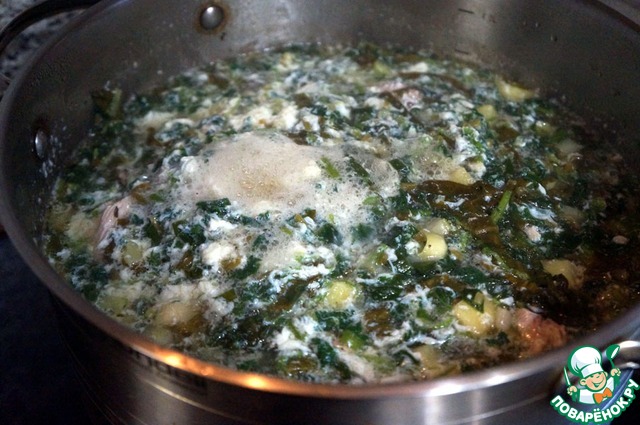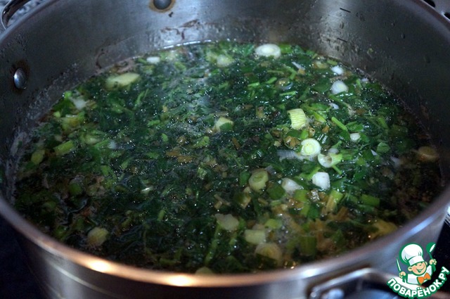 Как только щавель начнет менять цвет (побуреет), влить взбитые яйца, размешать – и снимать.