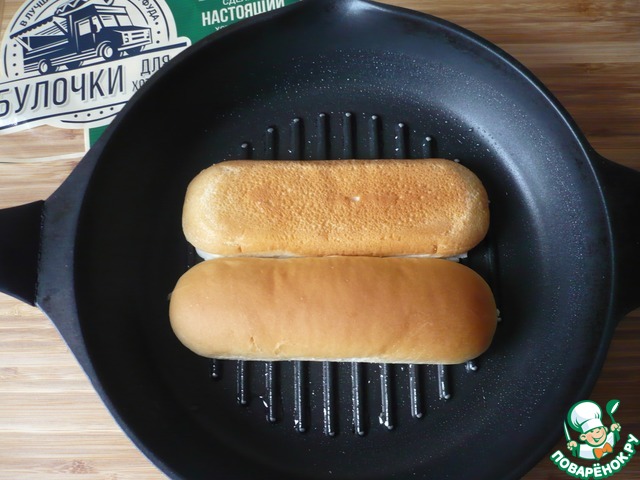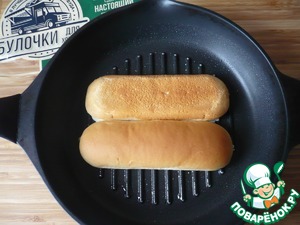 • Для приготовления хот-догов я буду использовать булочки ТМ "Bagerstat". Булочки аккуратно разъедините на две половинки. Слегка смажьте растительным маслом сковороду-гриль и нагрейте её. Обжарьте булочки срезом вниз.
