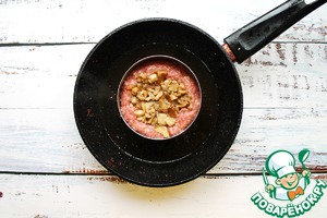 В миске смешайте мясной фарш, соль, перец, мелко резаный репчатый лук и измельченный чеснок, отбейте. В сковороду налейте растительное масло, разогрейте на среднем огне, положите формовочное кольцо и положите мясной фарш, утрамбуйте. Положите сверху обжаренные грибы и немного придавите внутрь. Обжарьте котлеты с двух сторон до готовности.