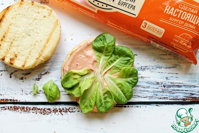 Смешайте майонез с кетчупом и смажьте нижнюю часть булочки. Уложите салатные листья.