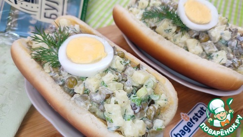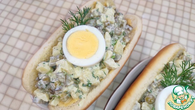 Хот-дог с мягкой булочкой, обжаренной сосиской, картофелем, солёным огурцом и зелёным горошком получается сочным и нежным. В больших компаниях на пикнике или даче исчезают незаметно. Также такой хот-дог станет отличным перекусом дома.