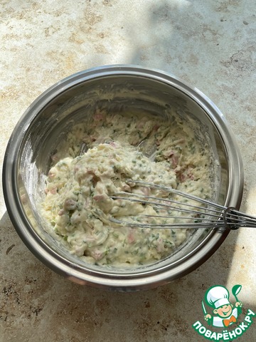 Сосиску (колбасу) мелко нарезать или натереть на крупную терку, сыр натереть на среднюю терку, перья лука и чеснока мелко нарезать, добавить мягкий творог (детский или можно заменить на йогурт, сметану, густой кефир), яйца, соль, сахар (по желанию, мягкое сливочное масло.