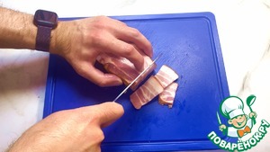 Первым делом бекон нарезаем тонкими слайсами.