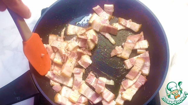 На сковороду наливаем оливковое масло, кладем нарезанный бекон, приправляем его черным молотым перцем.