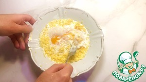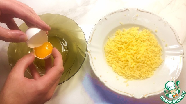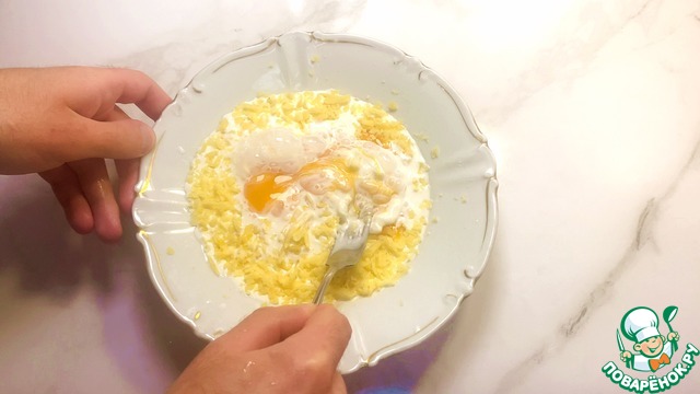 После чего яйца разделяем на белки и желтки, и желтки перекладываем к сыру.