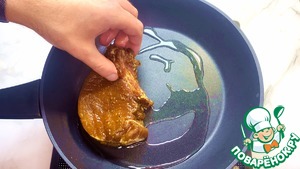 Потом на разогретую сковороду наливаем подсолнечное масло, кладем стейки и обжариваем, с одной стороны, до образования румяной корочки.
