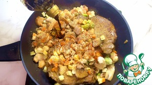 Мясо переворачиваем и кладем туда замороженные овощи.