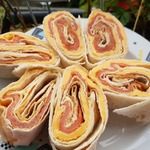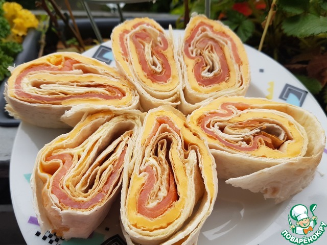 Третий лист промазать икорным маслом. Лаваши свернуть рулетом убрать в холодильник на 2 часа.