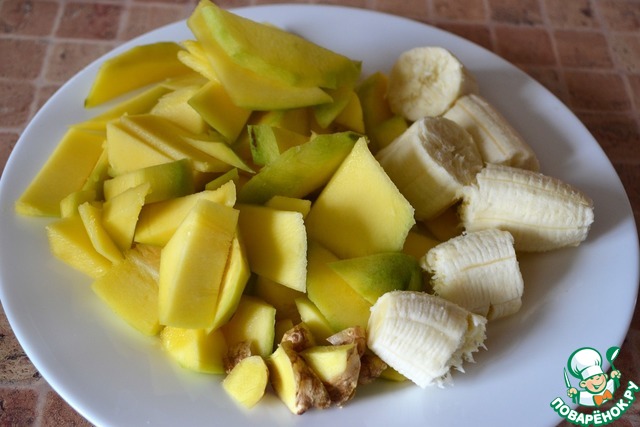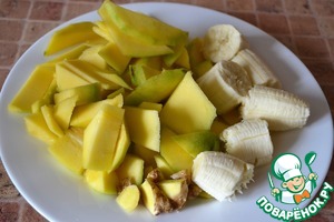 Нарезать очищенное манго, очищенный банан и свежий корень имбиря.
