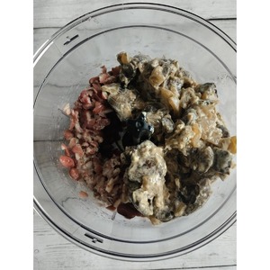 Из банки с фасолью слить всю жидкость и пропюрировать в чаше блендера. Туда же отправить обжаренные в сметане грибы с луком. Тщательно перебить все блендером.