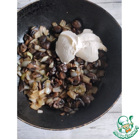 Грибы нарезать на 4 части, лук очистить и нарезать кубиком средного размера. Обжарить лук и грибы на сковороде в растительном масле до появления золотистого цвета у лука. Посолить, приправить орегано, добавить сметану и тушить еще минут 5.