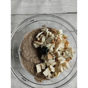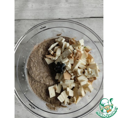 Колбасный сыр измельчить и отправить к фасолево-грибной массе. Опять всю тщательно пюрировать.