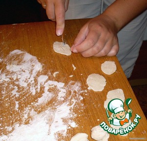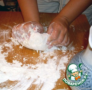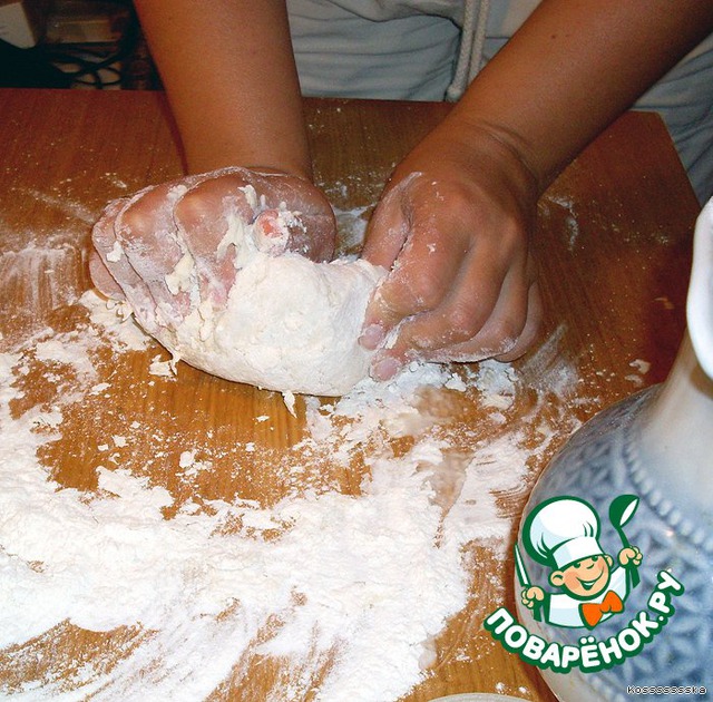 Прямо на столе это все смешиваем, если крошится, добавляем водички. Трем до изнеможения ручками прямо на столе. Должно получиться эластичное и очень крутое белое тесто. -