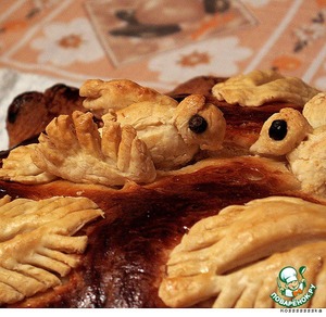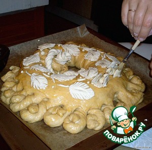 Украшения смазываем белком. Ставим в разогретую духовку на тепературу 250 градусов. Под противень ставим миску, наполненную на 30% водой. Это даст мягкость, пропеченность и вкусную корочку.
