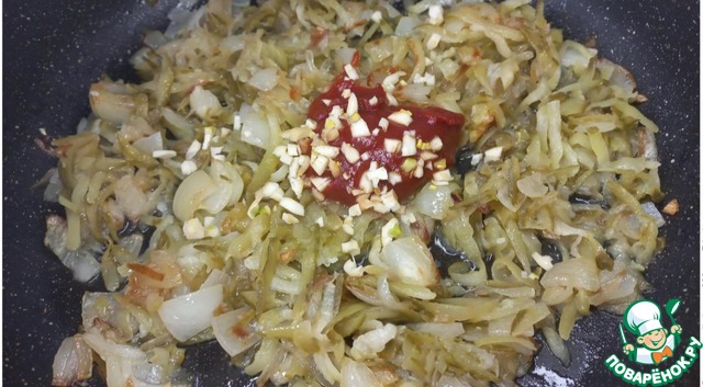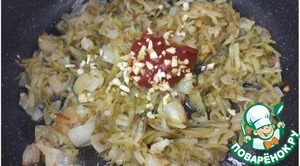 Добавляем томатную пасту, мелконарезанный чеснок, щепотку сахара. Всё аккуратно перемешиваем и продолжаем тушить 5 - 10 минут.