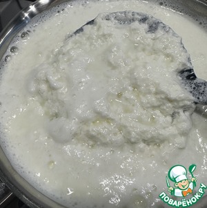 Дождитесь отслойки творога. Сыворотка должна стать прозрачной. Соберите образовавшийся творог в одну массу, помешивая к центру. Уменьшите огонь до ниже среднего и продолжайте варить изредка помешивая (раз в полчаса-час).