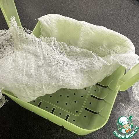 Выстилаем в сито марлю, перекладываем массу, подворачиваем края, сверху ставим пригруз. Оставляем на пару часов. Иримшик должен сформироваться и остыть.