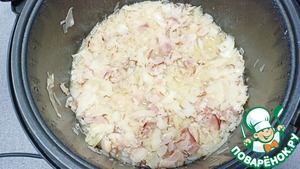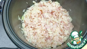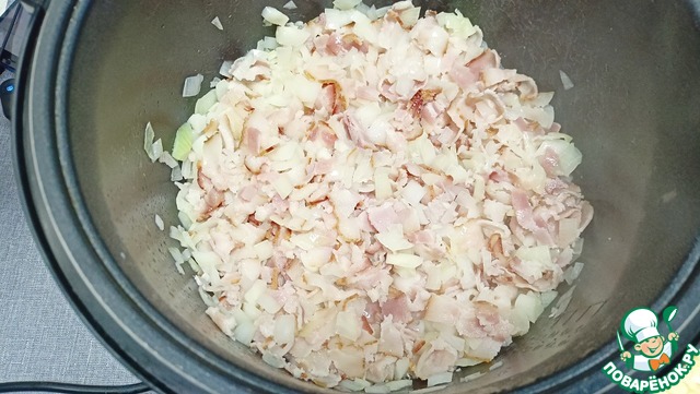Отправляем в чашу лук и бекон — Режим «Жарка» (t-160C) 15 минут. (Не забываем перемешивать каждые 2-3 минуты).