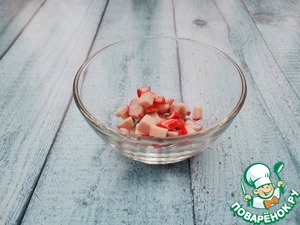 Нарезать крабовые палочки кубиками,
