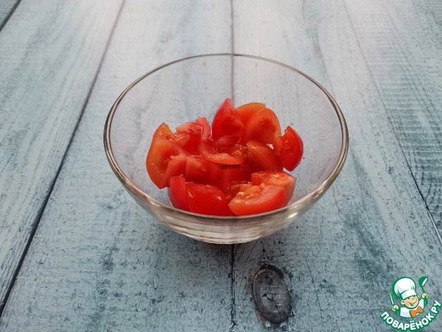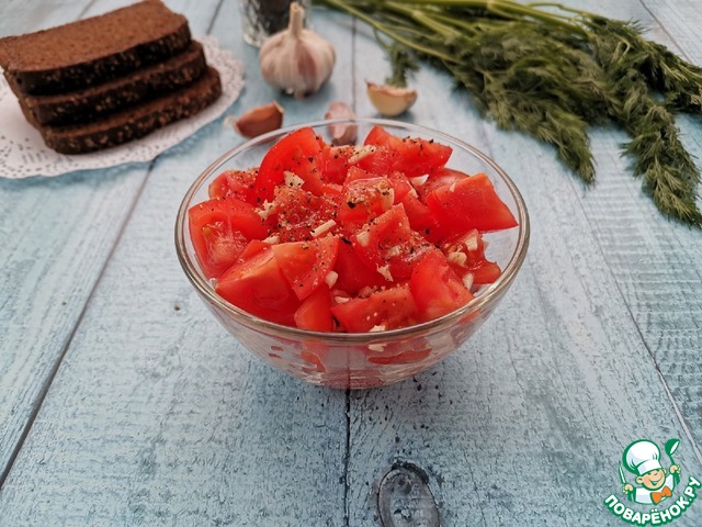 помидорки произвольными кусочками, чеснок измельчить.