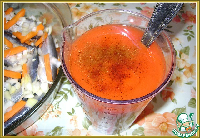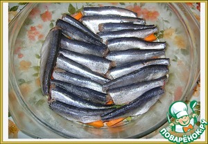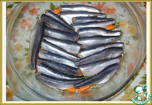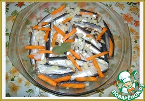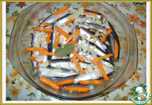 Слои повторить. Овощи - специи - рыба - овощи - специи. В итоге получилось 3 слоя лука с морковью и 2 слоя салаки. Верхний - овощи.