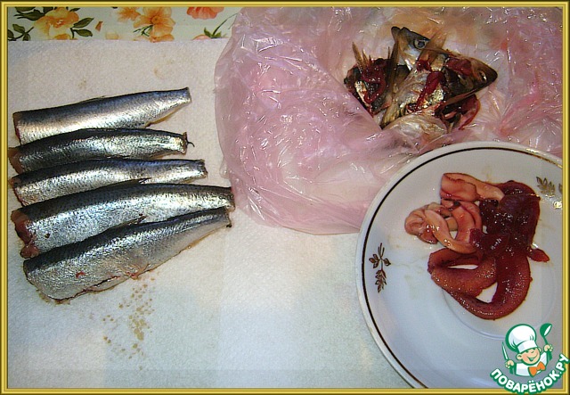 Рыбку выпотрошить, отрезать голову и хвостик. Икру и молоки я складывала отдельно на тарелочку. Чистый вес составил - 0,7 кг.