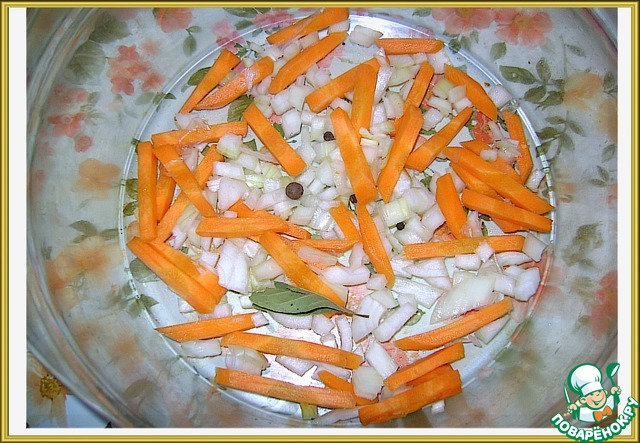Смешать измельченный кубиками репчатый лук и нарезанную толстыми (!) брусочками морковь. Овощей можно взять больше. Автор пишет, что лук вообще можно исключить. Я - добавила.