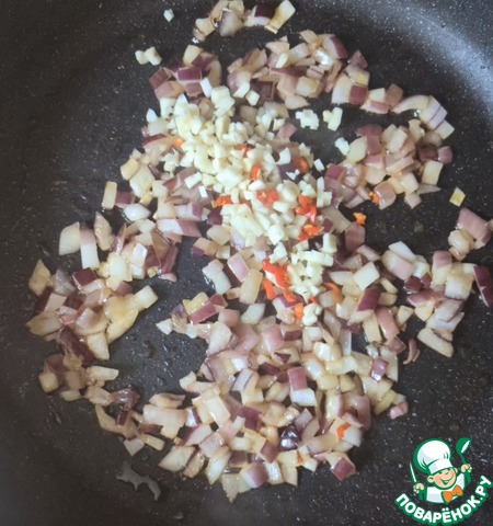 В разогретой сковороде поджарить лук на растительном масле. Добавить чеснок и чили, поджарить ещё несколько минут.