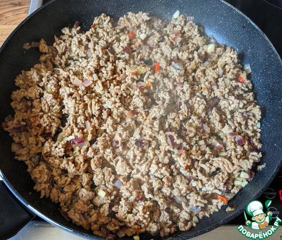 Добавить фарш, жарить, разбивая на мелкие кусочки до зарумянивания.