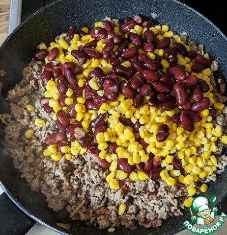 Всыпать фасоль и кукурузу в сковороду, перемешать. -