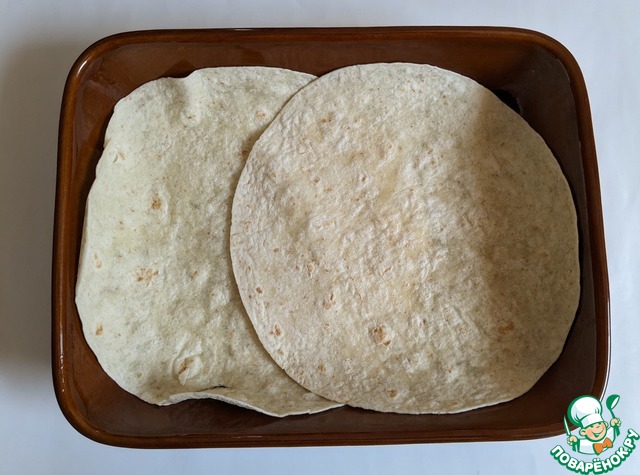 Форму смазать растительным маслом, уложить 2 лепёшки, закрывая дно.