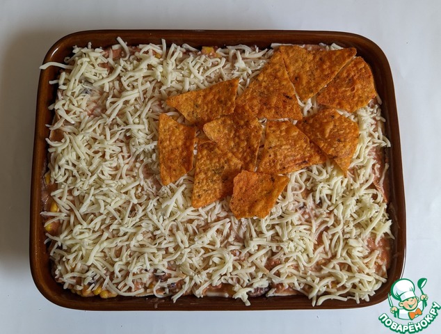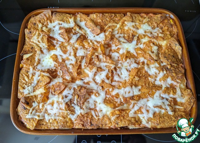 Посыпать обильно сыром, сверху разложить чипсы. Выпекать в духовке ~30 минут, смотрите по своей духовке.
