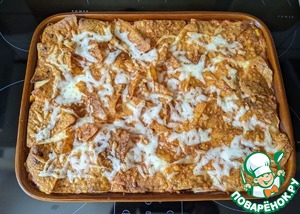 За 5 минут до готовности посыпала ещё немного сыром, побоялась, что чипсы будут жёсткие. В следующий раз немного покрошу чипсы, они останутся хрустящие и легче будет нарезать лазанью.