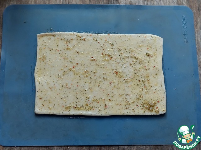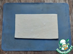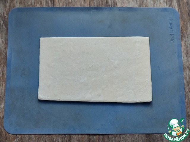 Слоёное тесто предварительно разморозить. Переложить на силиконовый коврик.