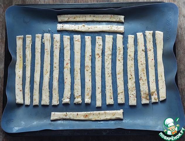 Разрезать тесто на равные части, шириной примерно 1.5 см. Выпекать в духовке, заранее разогретой до 180 град., 15 -18 мин.