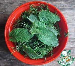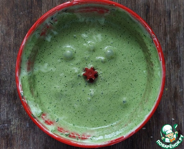 Пока готовятся палочки, приготовим соус. В блендер поместить сметану, промытый укроп и листья мяты.