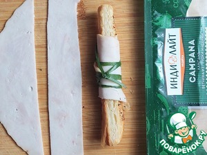 Обернуть каждую палочку ломтиками ветчины и завязать зелёным луком.