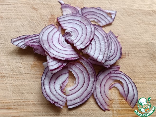 Лук полукольцами или кольцами, как вам понравится. От себя хочу добавить, что лук хорошо было бы замариновать. Я делала по рецепту, но думаю, что с маринованным будет даже вкуснее.