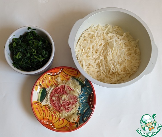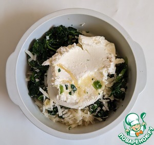Сыр натереть на тёрке, чеснок выдавить/натереть, шпинат отжать от воды.