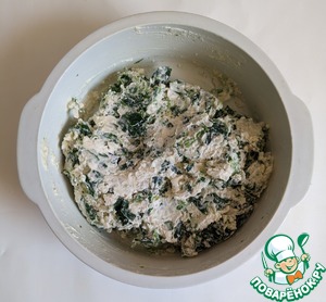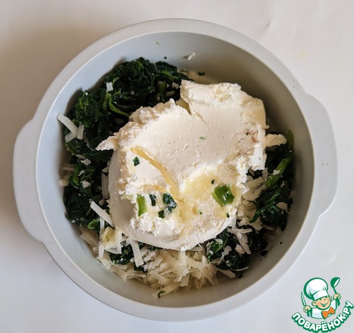 Смешать сыр, чеснок и шпинат, добавить сливочный сыр и пряности.