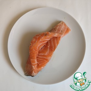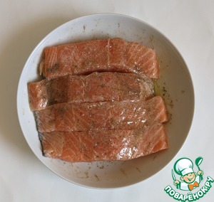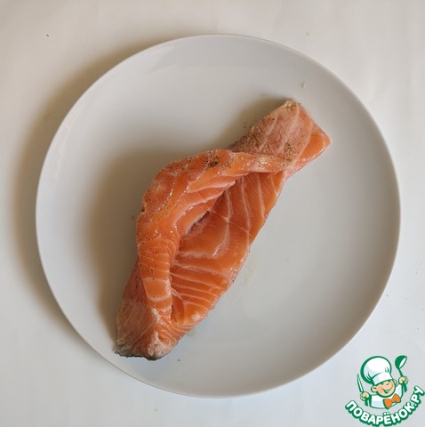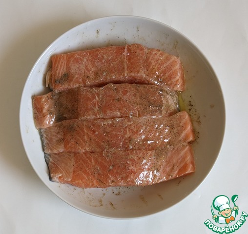 Лосось посыпать солью и чёрным перцем, полить по 1ст. ложке лимонного сока и оливкового масла.