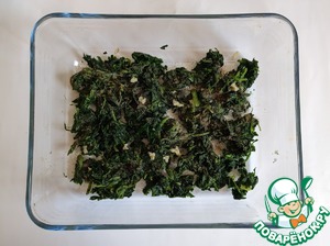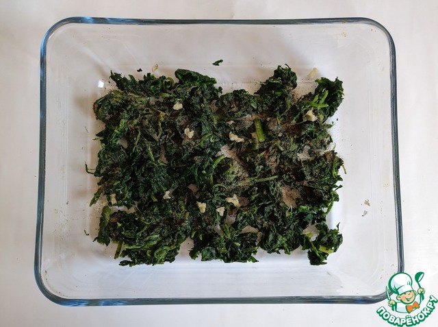 Оставшийся шпинат отжать от воды, выложить в форму для запекания. Посыпать солью, чёрным перцем и мускатом.
