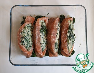 В каждый кармашек положить 1/4 начинки и выложить в форму на шпинат.
