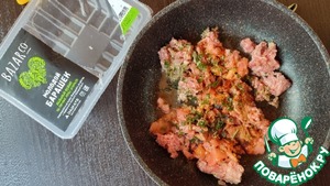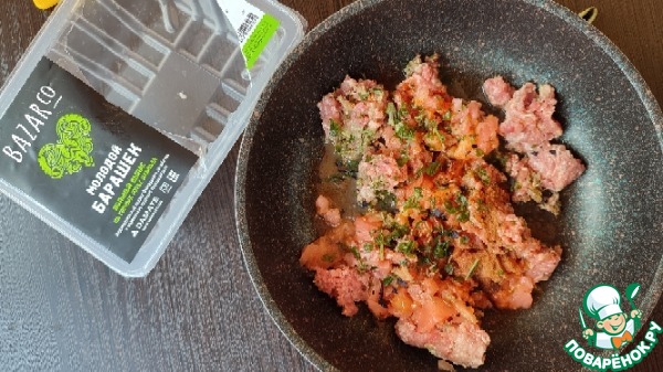 Обжарить на растительном масле фарш, добавив туда все специи, томатную пасту и сердцевину от помидоров. Обжарить быстро на сильном огне.