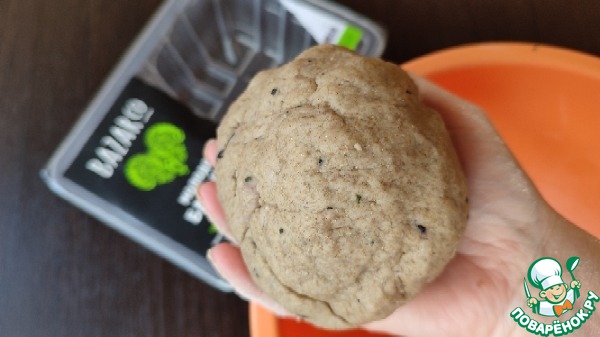 • Добавляем соль, растительное масло, базилик и кипяток. Вымешиваем тесто и убираем в пакет на 10 минут.