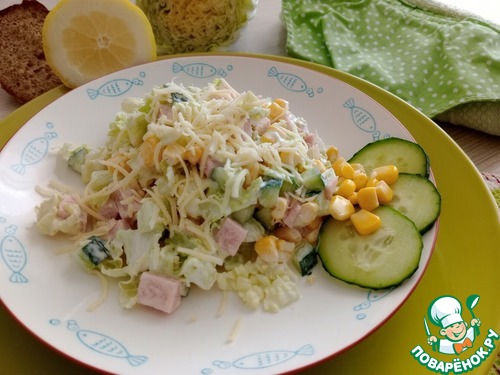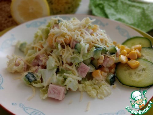 Шинкуем пекинскую капусту и добавляем кукурузу. Осталось приготовить заправку. Все ингредиенты я, обычно, смешиваю в глубокой миске, а потом подаю порционно, посыпав сверху натертым на мелкой терке сыром.