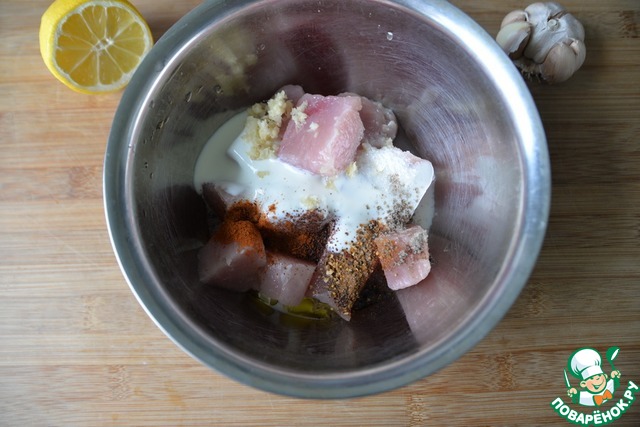 Добавляем к филе йогурт, оливковое масло, сок лимона, соль, выдавливаем чеснок, кладём смесь перцев, сумах, кардамон, паприку.
