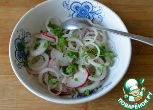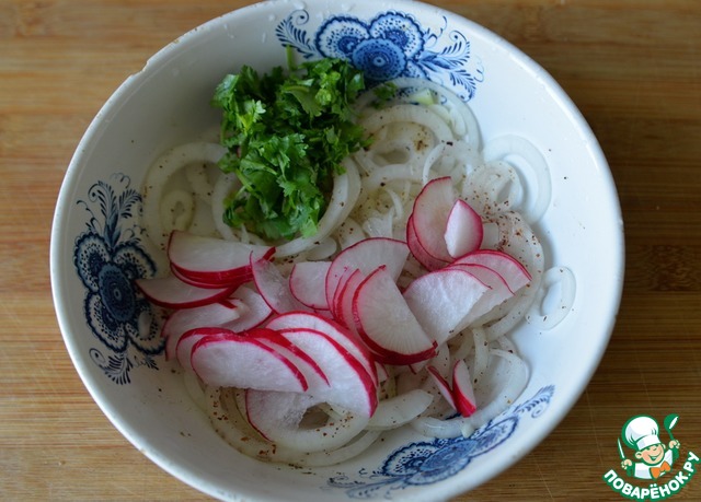 Редис и кинзу моем, режем. Кладём в салат тонкие колечки редиса и нарубленную кинзу.